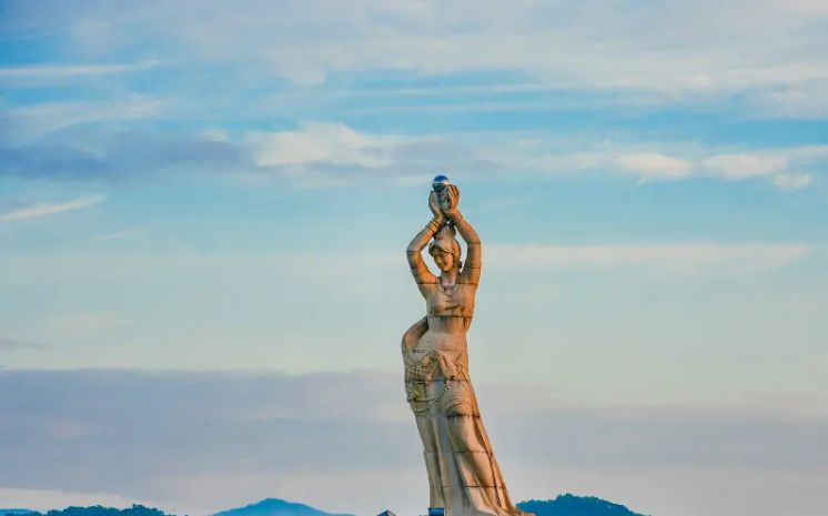 The Statue of Fishing Girl in the bay shows the fisher girl holding this bright pearl up into the air with both hands, admiring its luminosity which symbolizes the simple beauty of Zhuhai. Over the fishing girl's shoulder and across muddy waters, sits the glistening lights & iconic skyline of the island of Macau. Visitors to Zhuhai can take a ferry-ride out across the bay and around Macau.